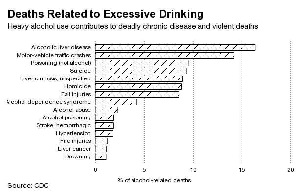 从肝损伤和酒精中毒到酒后驾驶造成的车祸、跌倒和谋杀,过量饮酒每年在美国造成数万例死亡——每天240例。