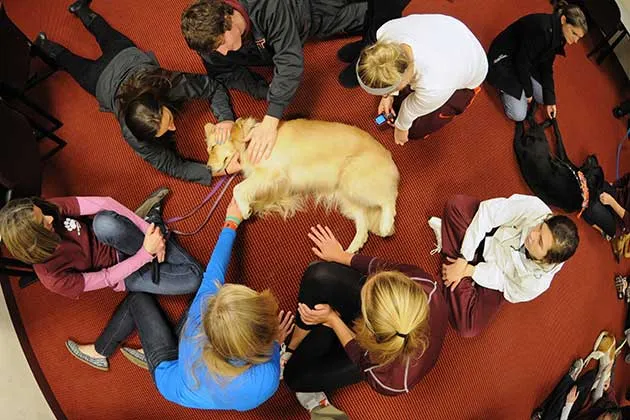 弗吉尼亚理工大学帮助PAWS访问弗吉尼亚理工大学的莱恩体育场,为学生运动员提供宠物疗法学习休息图片来源:Dave Knachel/弗吉尼亚理工大学