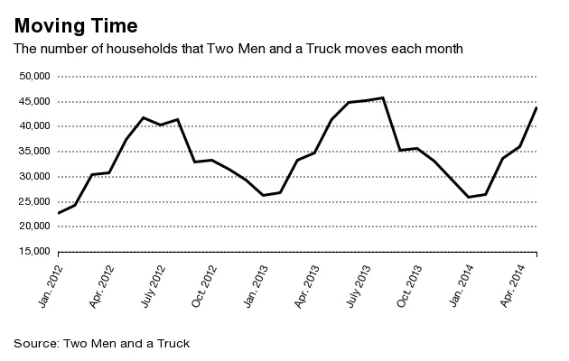 如果你认为你有一个忙碌的周末计划,感谢你不经营一家搬家公司。Two Men and a Truck是一家在美国和海外拥有300多个地点的搬家特许经营公司,预计将在今天到周日帮助5,189个家庭搬家。高峰期恰逢天气变暖和美国人在学年结束后搬迁时房屋销售的上升。