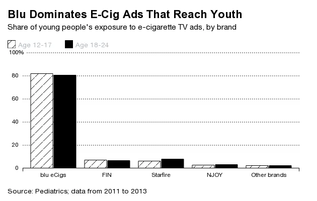 根据一项在 Pediatrics 杂志6月发布的对尼尔森数据的 分析,Blu还负责80%的青少年和年轻人可能在近年来看到的电子烟电视广告。该研究得出结论:“电子烟公司向包括2400万青少年在内的广泛受众宣传其产品,青少年和年轻成年人在电视上的曝光量在2011年至2013年间显著增加。”Blu的母公司Lorillard周一早上未能回复置评请求。