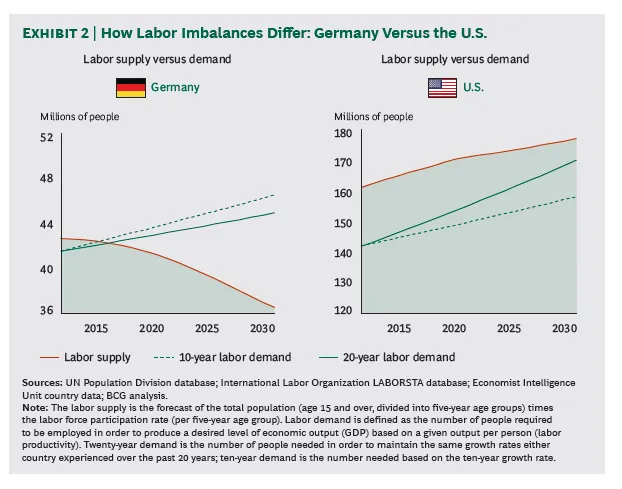 这份报告名为全球劳动力危机,预测了一个国家在其国内生产总值和劳动生产率继续以近期相同速度增长的情况下所需的劳动力数量。然后,它将这种假设的劳动力需求与国际劳工组织基于人口增长和劳动参与率的劳动力供给预测进行比较。