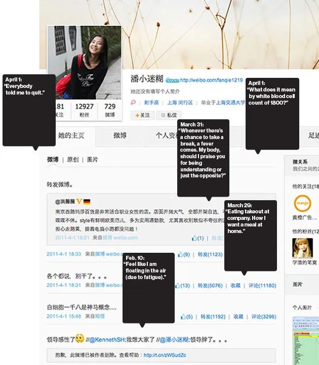 微博网站 新浪微博 上充满了对压力生活的抱怨和关于人们工作到死的新闻报道的讨论:一名24岁的奥美公关全球员工,一名25岁的普华永道审计师,一名战斗机设计师。“加班有什么意义,难道是为了工作到死?”一位微博用户问道,并指出他自己的老板告诉员工要在工作上花更多时间。