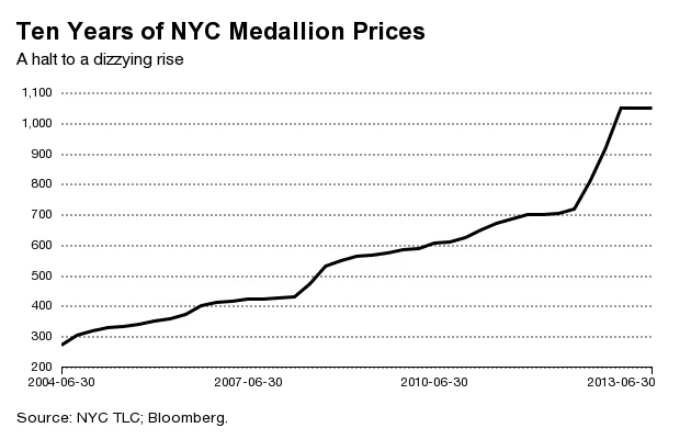 这可能过于乐观。芝加哥和旧金山的勋章价值也出现了 类似的压力迹象。彭博社保留了过去 10 年纽约勋章定价的季度数据,最后一次价格在整整一年内下降是在 2000 年至 2001 年。过去十年中唯一一次价格下降发生在 2013 年第三季度;降幅微小——仅 1 美元——市场在上个月略微下跌之前保持稳定。