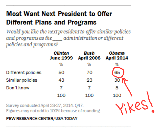 三分之二的选民表示,他们希望下一任总统,无论他是——还是她!——能够提供与奥巴马不同的政策。作为他内阁的前成员,克林顿在绝大多数问题上与他意见一致,这使她作为总统候选人的最大劣势。令我感到惊讶的不是她在微妙地与奥巴马保持距离,而是她没有更加公开地表达这一点。