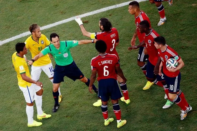 巴西明星内马尔在一场因裁判允许的身体对抗而迅速声名显赫的比赛中遭遇的赛季结束伤病引发了 投诉,称国际足联指示裁判对罚球要宽松。即使是同样著名的路易斯·苏亚雷斯 咬人事件 在比赛中也没有受到任何惩罚。