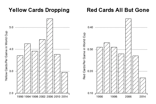• 球员在比赛中学会了更好地表现,导致牌照减少。 • 裁判通过警告、犯规和任意球更好地管理比赛,从而避免了需要出牌的更高程度的报复。 • 球员和裁判都知道国际足联希望比赛加快,这意味着粗暴的比赛会被更好地容忍。也许这就是高观众人数的公式:让球员们打得粗暴,不惩罚任何人,创造一个 如此快速的球 以至于打破了之前的得分记录。球员们可以在摄像机关闭后再处理他们的 脑震荡 。