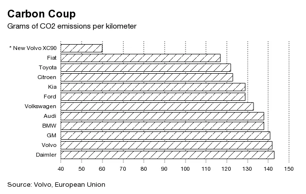 撇开语义不谈,这个配置令人印象深刻。沃尔沃承诺XC90的马力可达400,同时每公里仅排放约60克二氧化碳。丰田的普锐斯 每公里排放约89克二氧化碳。欧盟希望到2015年,整个大陆所有车辆的平均排放量将降至 每公里130克—到2020年降至95克。