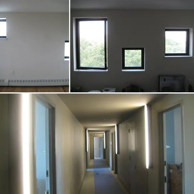 公寓内的不对称窗户(顶部)和时尚的照明走廊。马克·伯恩斯(Mark Byrnes)照明显然是阿贾耶在整个建筑设计中的主要关注点之一。每层楼的走廊上装饰着垂直照明设备,为这一通常受到忽视的住宅建筑部分增添了意想不到的时尚感。在公寓内部,不对称的窗户为原本简单的空间增添了个性。但根据它们在房间之间的对齐方式,这可能是一个令人兴奋或令人沮丧的特征。在现场,这似乎是建筑最显著的建筑缺陷。
