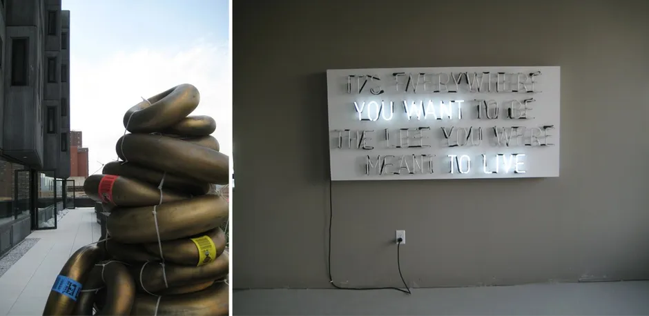 展览“如果你建造它”中展示的一些艺术作品,内外皆有。马克·伯恩斯一次访问值得流汗。展览占据多个楼层,利用房间和公共空间展示来自十多位艺术家的作品,探讨种族、商业和社区问题。该展览将持续到8月10日,既是艺术展,也是建筑向城市的介绍。在九楼,谢雷扎德·加西亚的金色涂装内胎和行李标签生动地表现了西班牙语移民在美国的脆弱性。走廊里,纳里·沃德以“糖山微笑”的罐头幽默地探讨文化挪用。沃德对哈莱姆作为品牌来营销非哈莱姆生产的产品的使用感到好奇,让当地人对着罐子微笑,然后封存并以10美元的价格出售。(收益用于BHC项目。)
