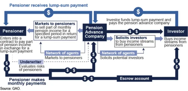 根据美国政府问责办公室的一份 报告,大约三十多家公司在一个相互关联的网络中,正在营销和销售昂贵的方式,让退休人员以其养老金为抵押借款。政府问责办公室调查了被称为养老金预付款的情况,养老金领取者以一次性付款换取在设定年限内交出每月的养老金支付。政府问责办公室发现,这些产品对借款人来说是“不利的”,有效利率高达90%。这些预付款通常还要求退休人员购买人寿保险,使其成本更高。