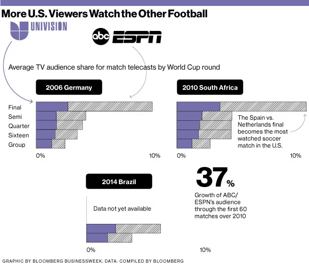 对于 华特·迪士尼的ABC和ESPN来说,他们拥有美国英语转播的版权,前60场比赛的总观众人数比2010年世界杯增长了42%。对于西班牙语版权持有者Univision来说,观众人数比2010年增长了38%。这些数据不包括两个网络的流媒体服务的创纪录流量或在酒吧观看的人群。