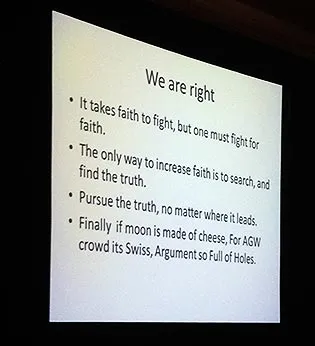 Bast的举止严肃而低调。曾经是环保主义者的一个热门妖怪,他和哈特兰最近在主流中的相关性下降,因为越来越多的公司——包括以前的资助者如埃克森美孚——虽然他们的高管仍然对行业在造成气候变化中的作用表示怀疑,但也不得不接受气候变化作为一种政治现实。在他的演讲中,Bast辩称哈特兰并不提倡否认气候变化,而是对科学共识持怀疑态度,认为人类(人为)全球变暖对地球构成严重威胁。哈特兰认为这种全球共识是危言耸听的,并且对经济造成了伤害,尤其是因为,正如Bast所声称的,“数据并没有显示过去17年有任何变暖。”