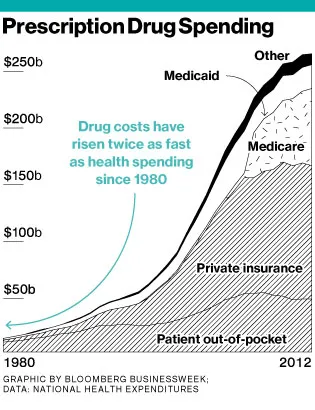 自1990年代末以来,处方药的费用一直占美国总医疗费用的约10%。不过,个人支付的金额发生了变化。半个世纪前,患者承担了超过90%的药物费用。直到1991年,美国人仍然直接承担超过一半的药物费用。到2012年,他们只支付了18%。随着治疗变得更加复杂和昂贵,私人保险公司和医疗保险承担了更大份额。