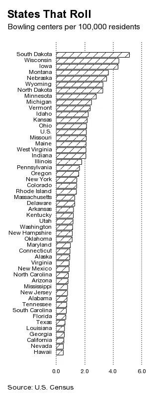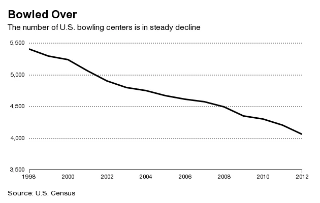 美国在2012年有4061个保龄球中心,比1998年减少了25%,1998年是美国人口普查收集一致数据的最早年份。但保龄球馆的衰退可能早在此之前就已开始。美国在第二次世界大战结束到1958年之间增加了2000个保龄球馆,当时美国规划官协会 报告称“保龄球馆正迅速成为参与性运动和休闲活动中最重要的——如果不是 最 重要的——地方中心之一。”(这一增长包括1947年在白宫安装的 双车道保龄球馆。)