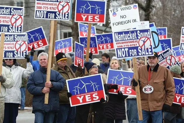 2010年凯普风电场的支持者和抗议者照片由Joanne Rathe/波士顿环球报通过Getty Images提供能源部已提供1.5亿美元的贷款担保,这可能成为美国建造的第一个海上风电场——计划在南安普顿海峡中部建设的凯普风电项目。