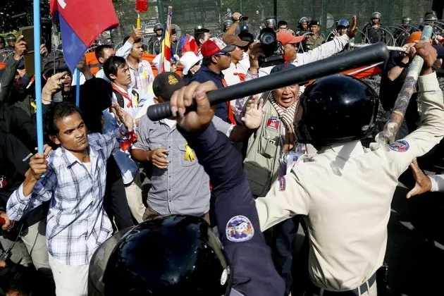 当挥舞柬埔寨国旗并高喊“民主万岁”的抗议者开始展开一条大型橙色横幅时,身穿制服的安全警卫向人群开火,似乎使用的是钢珠枪,正如一段由柬埔寨人权组织Licadho拍摄的 视频所显示的那样。在随后的混乱和暴力中,至少有16人受伤。一些抗议者用旗杆袭击安全人员,据美国之音新闻报道.