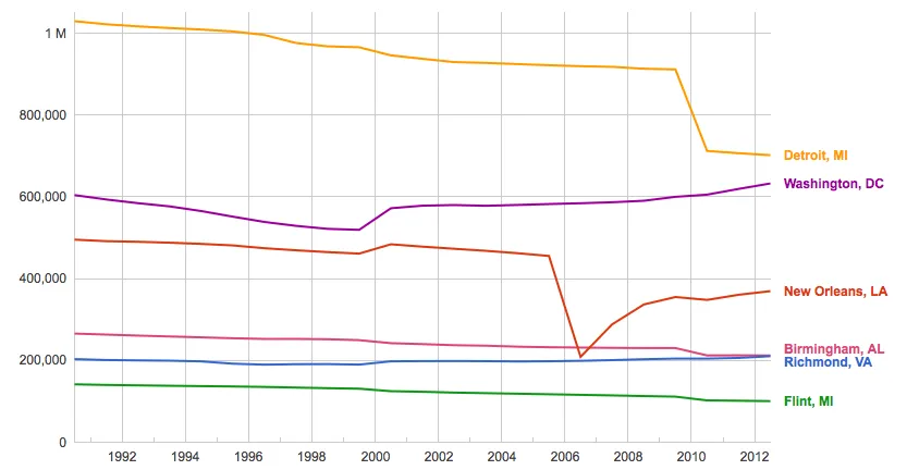 人口,1990–2013。美国人口普查在这六个城市中,华盛顿特区是唯一一个谋杀率显著下降的城市——实际上低于每10万人20起。在华盛顿,且在一定程度上在里士满,人口的增加大致与犯罪的减少相对应。里士满2012年每10万人20.2起谋杀远低于伯明翰(31.4)、新奥尔良(53.2)、底特律(54.6)或贫困的弗林特(62.0)——这些城市都在衰退。数据来自FBI 2012年的犯罪数据,尽管有许多警告,但总体趋势是显而易见的。