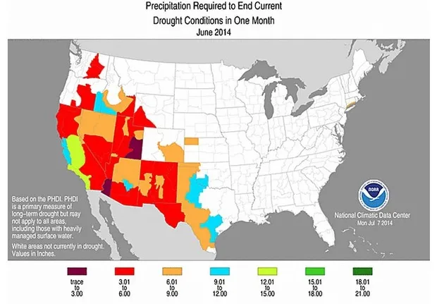 这张地图, 被NOAA推特发布,是对不可能结果的说明。(它的日期是6月,尽管自那时以来加利福尼亚几乎没有降雨,可以安全地假设它仍然适用。)虽然该州北部和东南部需要相对适中的3到6英寸的降雨才能摆脱干旱,但干旱的中央谷地(美国大部分粮食的种植地)需要12到15英寸的圣经式降雨。为了更好地理解,15英寸的液态降水相当于12.5英尺的雪。