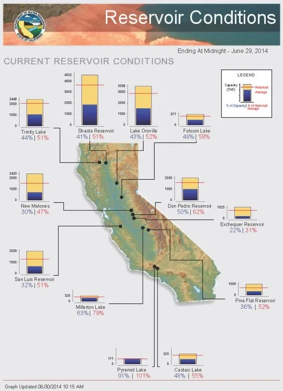 政府最新的 气候评估 描绘了加利福尼亚干旱景观的严峻形势。该州90%的地下土壤“缺水或极缺水”,反映出这段干旱期的不可忍受的持续时间。四分之三的牧场和草原被认为处于“差到非常差的状态”。与此同时,许多水井的水位处于 20年来的最低水平,水库的情况也很糟糕,如下图所示,它们当前的容量与历史平均水平的对比: