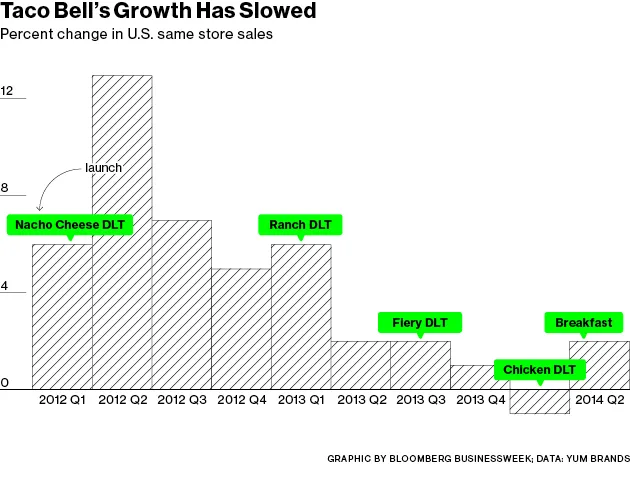 2014年初是两年来第一个出现负同店销售的季度。“虽然这个季度低于我们持续的预期,但我们仍然相信塔克贝尔有各种优势,我们期待着又一个强劲的年份,”百胜餐饮的首席执行官大卫·诺瓦克在今年春季的财报电话会议上表示,主要是指3月底在全国推出的早餐菜单,旨在挑战麦当劳在快餐早餐中的主导地位。