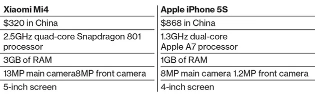 雷在周二北京介绍小米的Mi4智能手机摄影:张进/Corbis中国智能手机新兴企业小米正在将高端、低价设备的发布变成一种仪式。在周二北京的新闻发布会上,小米首席执行官雷军揭晓了Mi4,这是一款金属背壳的类似iPhone的智能手机,配备5英寸显示屏、最新的高通骁龙芯片,售价320美元,使其更接近中国中产阶级的消费能力,而iPhone 5S在中国的售价接近700美元。