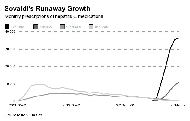 “它正在惠及成千上万的患者。它基本上使丙型肝炎患者的治疗人数增加了三倍或四倍,”IMS医疗信息学研究所的研究与开发主任迈克尔·克莱因罗克说。“我们唯一的问题是,在出现对获取的限制时,还有多少人可以接受治疗。”
