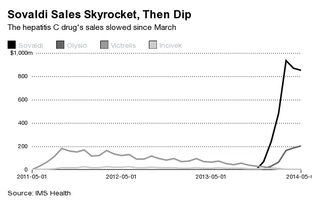 索非布韦并不是第一种高价药物,但其潜在的患者群体巨大:估计有300万美国人感染了丙型肝炎,尽管许多人没有症状且不知道自己被感染。保险公司和政府医疗保健项目对成本没有准备,仍在试图决定谁应该获得该药物。根据IMS Health的数据,这可能导致每月销售额自接近10亿美元的高峰后趋于平稳。
