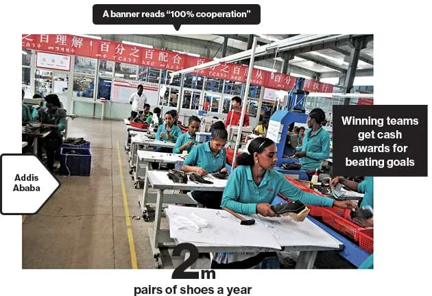 华建的3,500名埃塞俄比亚工人去年生产了200万双鞋。工厂位于该国首批工业区之一——这些地区提供更好的基础设施和税收减免——于2012年1月开始运营。张说,工厂在第一年就实现了盈利,现在每月赚取10万到20万美元,这一回报不足,他声称随着工人培训的改善,这一数字将会上升。在明亮的荧光灯下,伴随着机器的轰鸣声,工人们切割、粘合、缝制和缝纫前往美国市场的Marc Fisher皮靴。监督员在白板上监控配额,给予获胜团队小额现金奖励,并批评那些未达标的团队。