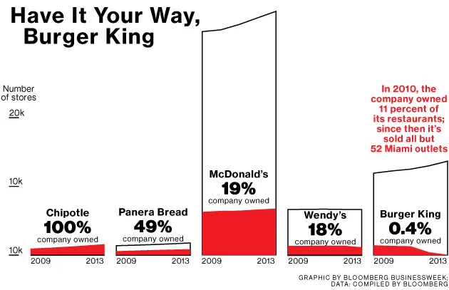 施瓦茨没有配合撰写这篇文章,他监督了许多削减。2013年,麦当劳在全球35,429家餐厅中拥有19%的股份。温迪汉堡在其6,557家门店中拥有18%的股份。历史上,汉堡王的运营方式大致相同:当3G在2010年收购该连锁店时,它在全球12,174家餐厅中拥有11%的股份。从那时起,汉堡王出售了除52家之外的所有餐厅;它保留最后几家用于培训高管和测试产品。
