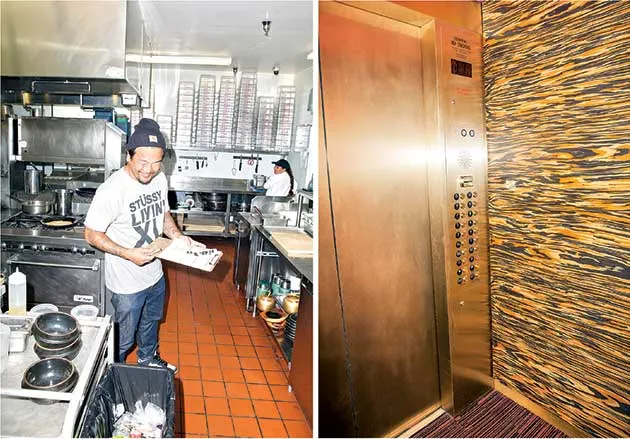 崔在Pot餐厅的厨房里;电梯令人眩晕的内部照片由范·罗宾逊拍摄