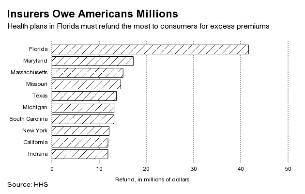 几乎有一百万佛罗里达州的保险购买者将获得退款,数量超过任何其他州。根据政府数据,佛罗里达蓝十字蓝盾计划单独需要向小型团体购买者退款超过1000万美元。同一公司的HMO计划,称为健康选择,欠款几乎相同。两项佛罗里达蓝计划的退款总额超过了任何其他州所有保险公司所欠的金额。发言人保罗·克鲁丁在一封电子邮件中表示,这些退款占佛罗里达蓝收取的保费的不到1%。