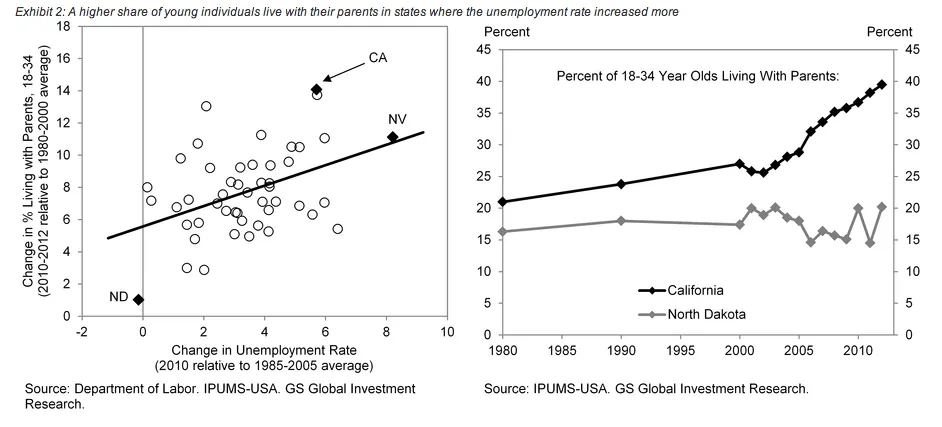 更多年轻的加利福尼亚人和父母同住的比例高于北达科他州高盛