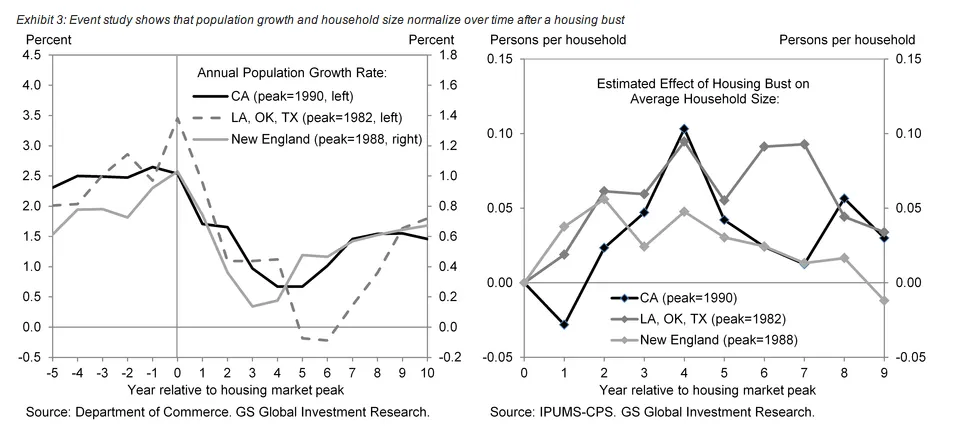 在三次地区住房崩溃期间,家庭规模先上升后下降。高盛