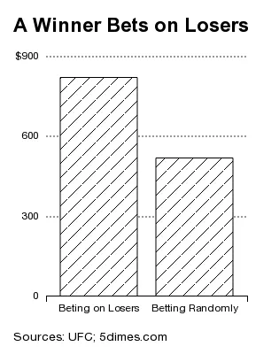为了判断这些战士是否达到了预期,或者远远落后于预期,我查看了UFC和体育博彩网站5dimes报告的赛前赔率。如果我们每次在一名战士的薪水超过其初始UFC薪水的三倍时下注100美元,那么在这15名战士的10年期间,我们将下注6200美元,最终获得820.03美元的收益:利润率为13.2%,比随机下注高出58%。
