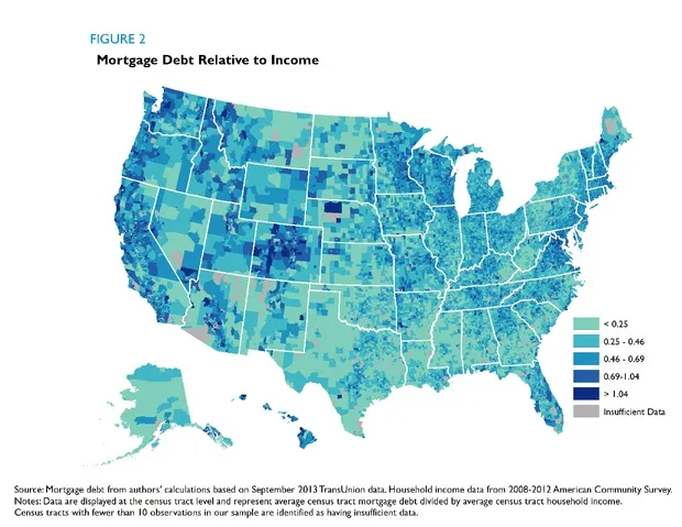 总体而言,总债务主要由抵押贷款债务驱动,两者之间的相关性为0.96。抵押贷款债务的地理集中度也高于总债务。正如报告所指出的:“前20%的普查区占美国抵押贷款债务的48%,而后20%仅占3%。”
