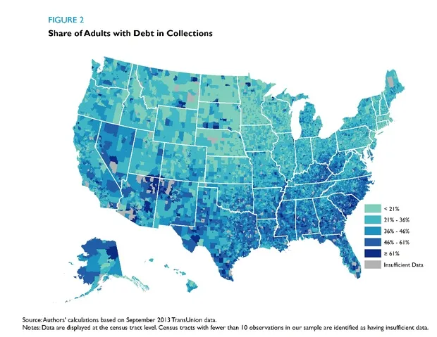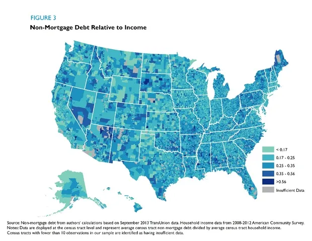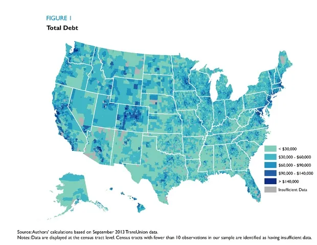 这些报告关注美国各州和大都市地区债务的地理分布。该研究与Encore Capital Group的消费者信用研究所(CCRI)合作进行,基于2013年的信用信息,覆盖了700万成年人的随机样本。(大约9%的成年人没有信用档案,通常是低收入消费者,因此未被纳入)。他们收集了50个州和100个最大大都市地区的总债务、抵押贷款日期、逾期债务和催收债务等多项指标的数据。