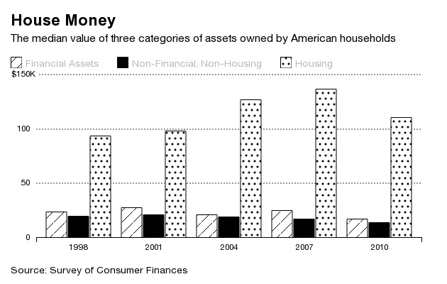 房地产资产的中位值(包括主要住宅和其他财产)在住房泡沫期间增加了38%。与此同时,金融资产的中位值,如支票账户、401(k)、股票和债券,从2001年到2007年下降了9%——而在此期间,标准普尔500指数上涨了超过20%。非金融资产的价值——汽车、珠宝、商业所有权——也下降了18%。
