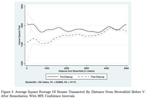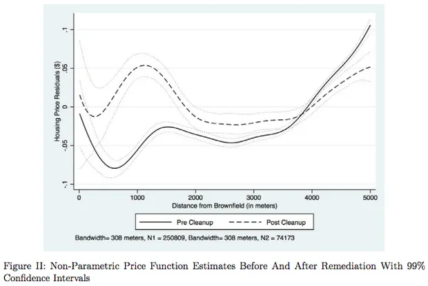 这篇论文是凯文·哈宁格、拉拉·马和克里斯托弗·蒂敏斯的研究,推进了对“环境绅士化”的最新研究——作者将其描述为“一个过程,其中社区的社会经济特征变化伴随着环境设施的变化。”虽然这不是第一项试图通过测量附近房产价值变化来评估棕地修复有效性的研究,但该报告利用Dataquick信息系统的住房数据,考察了整个EPA棕地计划。