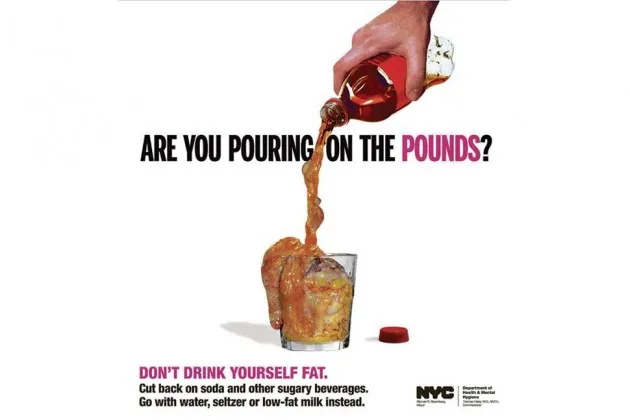 2009 纽约市卫生局在地铁车厢上张贴反汽水广告,呼吁人们不要“喝出肥胖”。注意那瓶没有标记的红色瓶子。