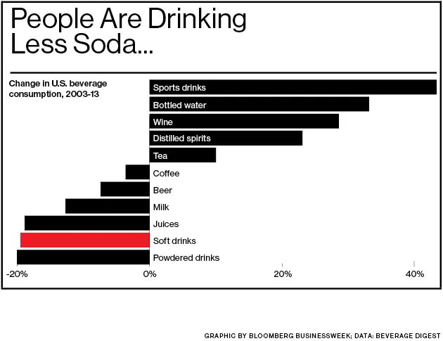 美国人可能还没有找到解决肥胖流行病的答案,但多年来他们一直将可口可乐和其他汽水视为原因之一。可口可乐试图对此进行反击。它试图忽视这一点。现在它接受了这一现实。这是道格拉斯必须面对的问题。他必须说服人们再次饮用可口可乐,即使他们不再像以前那样像喝水一样痛痛快快地喝。 文化变迁不会一蹴而就。它们是缓慢积累的——这里喝一口椰子水,那里买一包藜麦,突然间,美国饮食看起来与10年前截然不同。这在750亿美元的汽水行业中表现得尤为明显。几十年来,软饮料公司看到消费量上升。在1970年代,平均每人喝的汽水量翻了一番;到1980年代,它已经超过了自来水。1998年,美国人每年饮用56加仑汽水——这相当于每个国家的人口每年消耗1.3桶石油的汽水。