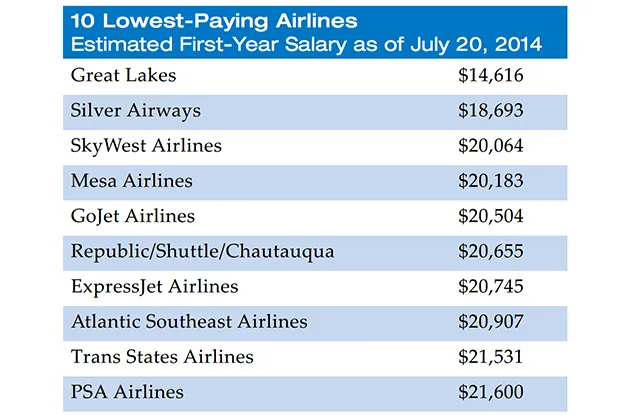 “地区航空公司提供的最低起薪已成为任何考虑成为航空公司飞行员的人,或者如果他们已经合格,选择在美国从事这一职业的严重障碍,”航空公司飞行员协会主席李·莫克说。由于高昂的培训费用和飞行员职业生涯前几年相对较低的薪水,该行业也面临着选择飞行作为职业的人数下降的问题。 以下是ALPA对10家美国地区航空公司首席副驾驶的第一年薪水的估计列表: