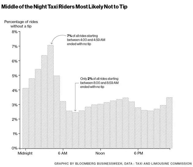 对于出租车司机来说,夜班是小费最差的时段。在清晨的早些时候,人们对金钱更加紧张。更多的人不留小费,平均小费降至18%。
