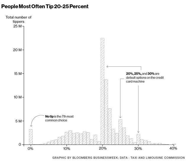 20%小费的普遍性可能也与纽约市出租车内的信用卡机器有关。屏幕上的按钮建议了三个默认小费水平——20%、25%和30%。图表显示了每个水平的峰值。Desai同意这些按钮选择正在影响乘客的行为。