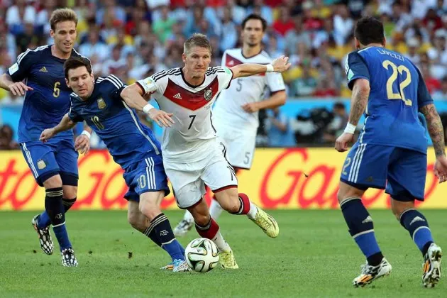 德国的巴斯蒂安·施魏因斯泰格在2014年巴西世界杯决赛中与阿根廷的梅西争夺,比赛于7月13日在里约热内卢的马拉卡纳进行摄影:斯坦利·周/盖蒂图片社世界杯决赛是一场三条条纹的盛会,德国队和阿根廷队都穿着阿迪达斯的球衣,同时踢着阿迪达斯的足球。唯一一个明显缺少阿迪达斯的地方——除了可能的大嘴巴半场表演——就是决定性进球者的脚: 马里奥·格策的制胜进球恰好是用耐克的标志踢出的。