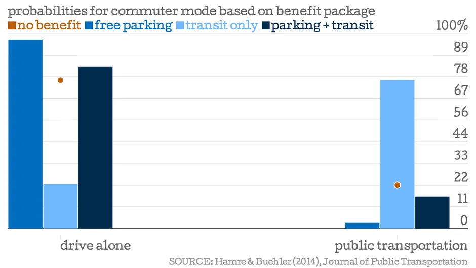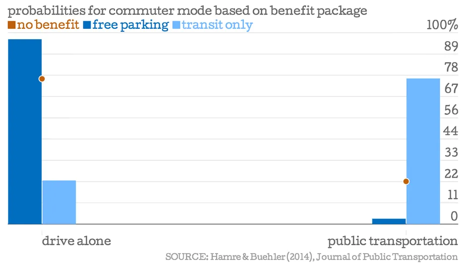 再说一次,很难指责一家公司提供免费停车,特别是如果它吸引了来自交通不便的郊区的优秀员工。有很多方法可以强调 替代 通勤,当然,但很少有雇主这样做而排除其他方式;在华盛顿特区的调查中,仅有7%的人在提供仅限公共交通通勤福利的地方工作。而在交通系统不如华盛顿地铁强大的城市,这种方法无疑更具挑战性。