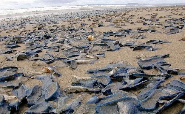Velella velella,这种现在在加利福尼亚出现的生物,2004年被困在海滩上。丹/维基媒体注意,想要给孩子满足感的旧金山父母们,便宜的宠物:拿个桶,赶紧去海洋海滩,那里的沙子最近被成千上万的可爱、紫蓝色的水母生物覆盖——而且几乎肯定对人类无毒!