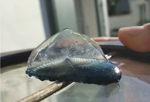 单个 velella 就是一场派对,它是一个“水螅虫”由不同的生物在一个三角形的帆下和谐共生。它们利用这个帆在水面上漂浮,形成 巨大的漂流,就像一块由小凡士林覆盖的气球制成的地毯。如果风的模式把它们冲上岸,这里可能就是发生的情况,它们基本上是无用的,萎缩成可怜的、皱巴巴的口袋,粘在你脚底。而这没关系,因为尽管食肉动物使用毒素攻击猎物,但根据 法拉隆海洋保护协会 的说法,“人类几乎感觉不到”它们的刺痛。(维基百科 建议 在处理后不要触摸脸部。)