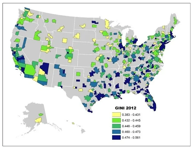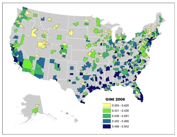 基于基尼系数的收入不平等在19个城市中超过0.50,其中佛罗里达州的塞巴斯蒂安-维罗海滩、那不勒斯和盖恩斯维尔;康涅狄格州的布里奇波特;乔治亚州的奥尔巴尼位列榜首。纽约、迈阿密和新奥尔良等大型城市,以及包括纽约的伊萨卡、西弗吉尼亚的摩根敦、密苏里的哥伦比亚、乔治亚州的雅典和德克萨斯州的大学城在内的几个大学城的不平等情况也特别高。
