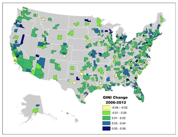 在大型城市中,新奥尔良、杰克逊维尔、盐湖城和亚特兰大等城市的不平等情况上升最多。但不平等的绝对增加主要发生在南方和中部地区的一些较小城市,包括密苏里的哥伦比亚、威斯康星州的沃索、纽约的伊萨卡、乔治亚州的达尔顿、犹他州的圣乔治、缅因州的刘易斯顿-奥本、俄勒冈州的科瓦利斯、北达科他州的格兰德福克斯、加利福尼亚州的汉福德-科尔科兰和南卡罗来纳州的安德森。相比之下,纽约、华盛顿特区、洛杉矶、圣荷西、旧金山和波士顿的不平等情况仅略有上升。