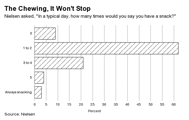 考虑到市场上已经有无数种不同类型的零食(这可能是我们零食消费增加的一个原因),像 通用磨坊 这样的公司渴望理解并利用我们的零食行为。在 Nielsen 对1139人的新调查中,91%的人表示他们每天都吃零食,其中25%的人每天吃三到五次零食,3%的人则是“总是在吃零食”。大约8%的人表示他们“总是”暴饮暴食,另有31%的人偶尔这样做。